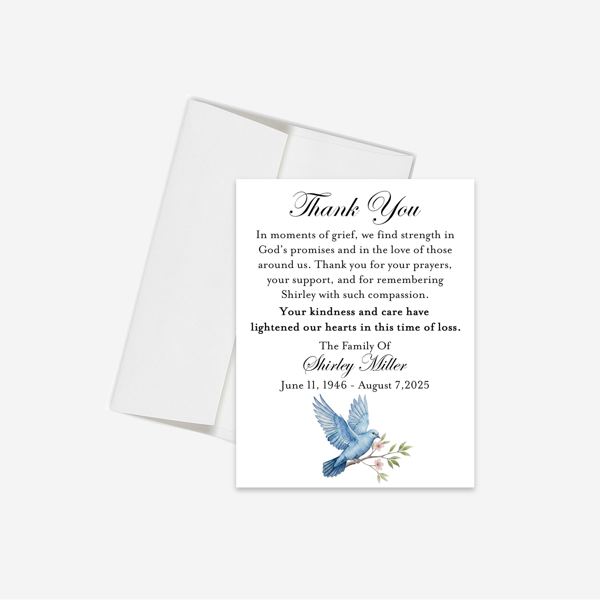 Each card is printed with your loved one’s name and dates, creating a meaningful keepsake that honors their memory while expressing appreciation to those who cared.