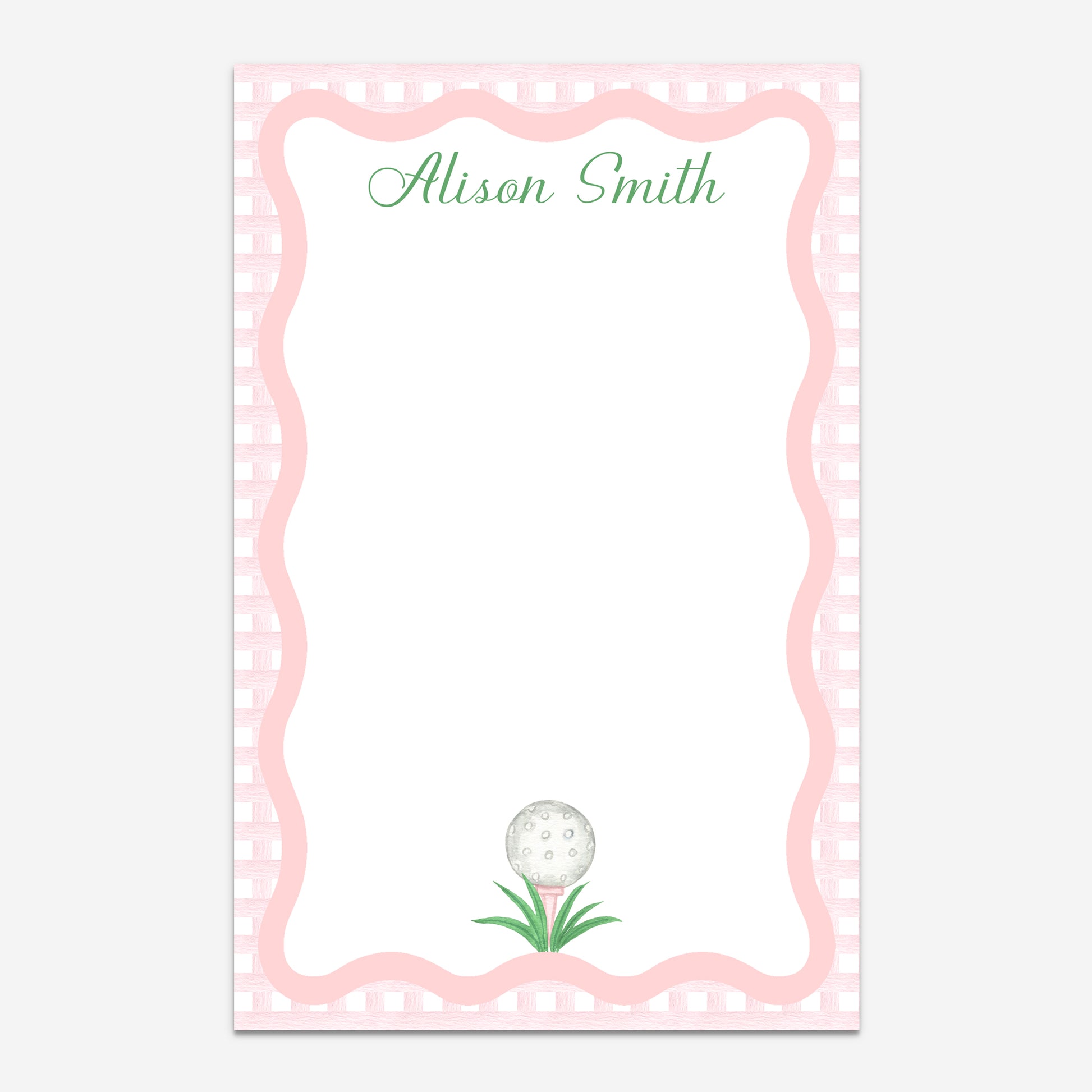 Perfect for the stylish golfer, this personalized notepad features a classic golf ball on a tee paired with a pink gingham border and wavy trim. Whether jotting down reminders or writing a sweet note, this notepad adds a fun, feminine flair to your daily to-dos.